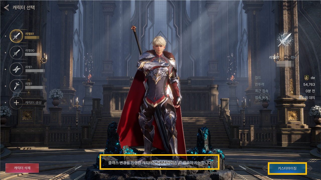 - 클래스 변경을 진행한 캐릭터는 커스터마이징 후 접속이 가능하며 커스터마이징 버튼을 눌러 커스터마이징을 시작할 수 있습니다.