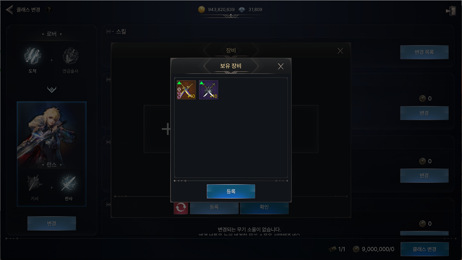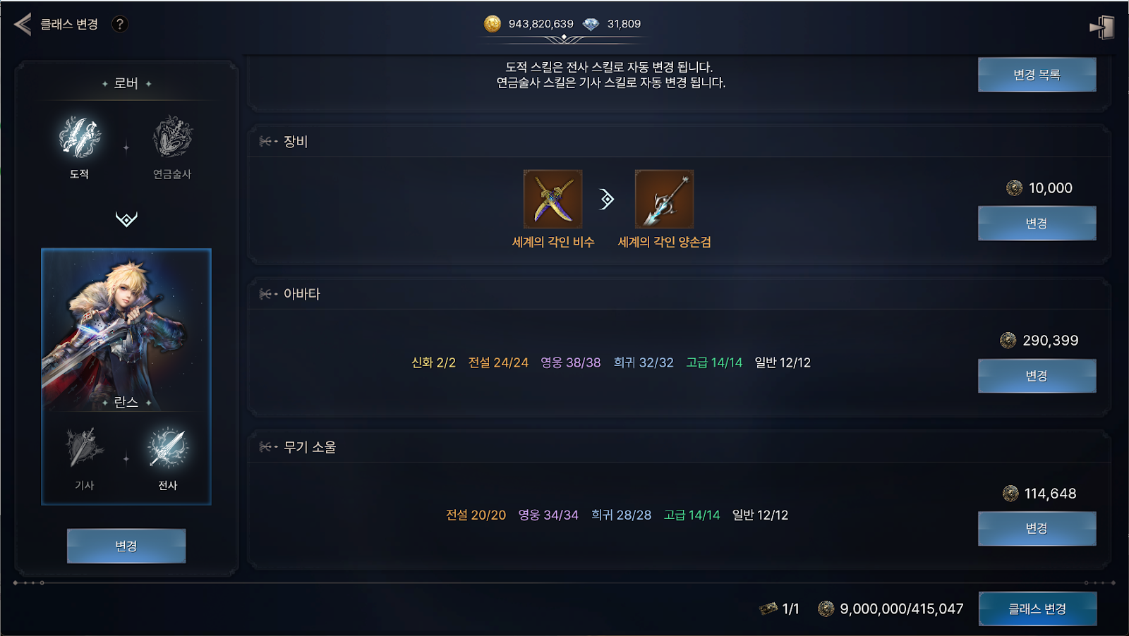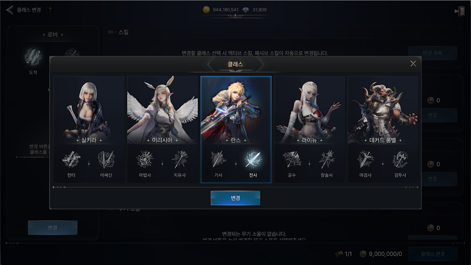 - 클래스 변경 화면에서 변경 버튼을 눌러 원하는 클래스로 변경 설정을 진행할 수 있습니다.