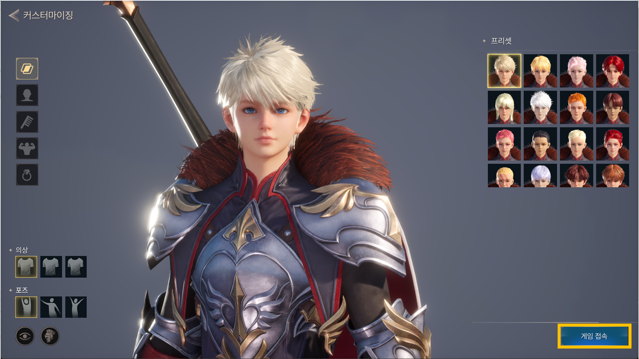 - 커스터마이징을 완료한 후 게임 접속 버튼을 누르면 변경한 클래스로 플레이 할 수 있습니다.