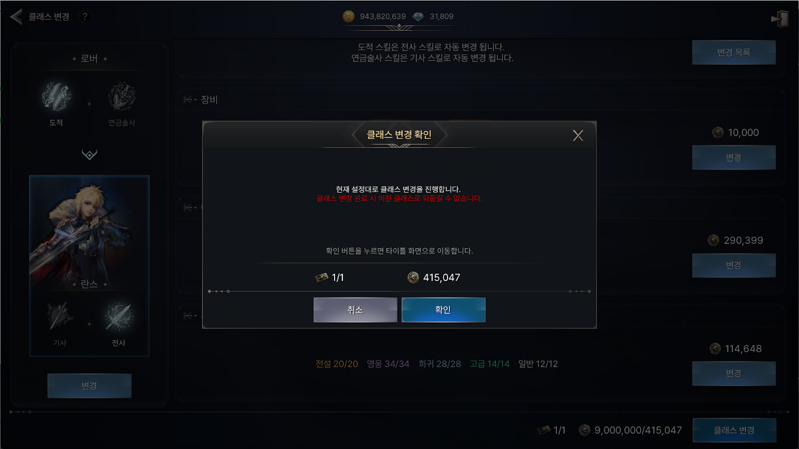 - 클래스 변경 버튼 클릭 시 소모되는 클래스 변경권, 클래스 변경 코인 개수가 표시되며 확인 버튼을 눌러 클래스 변경을 진행할 수 있습니다.