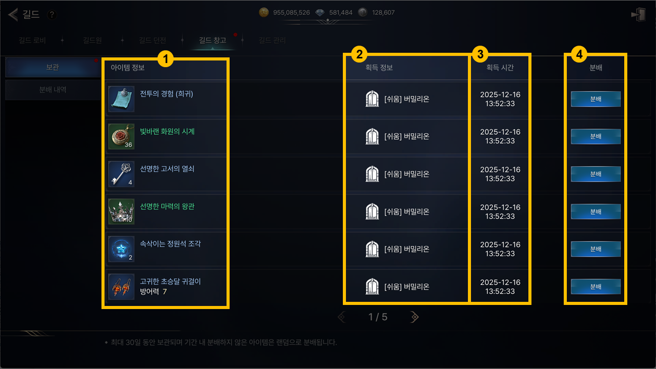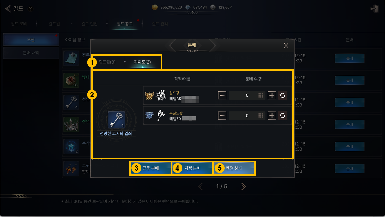 - 보관 아이템이 분배 목록의 길드원의 배수와 맞지 않을 경우 균등 분배를 할 수 없습니다.
