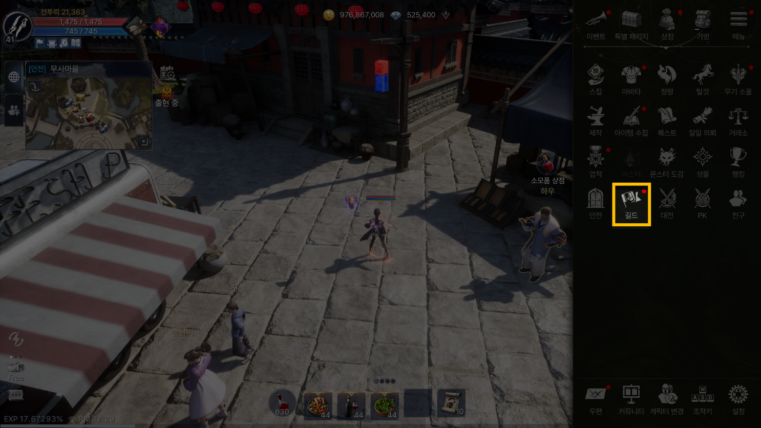 - 화면 우측 상단 [메뉴] – [길드]를 눌러서 길드 메뉴로 진입할 수 있습니다.