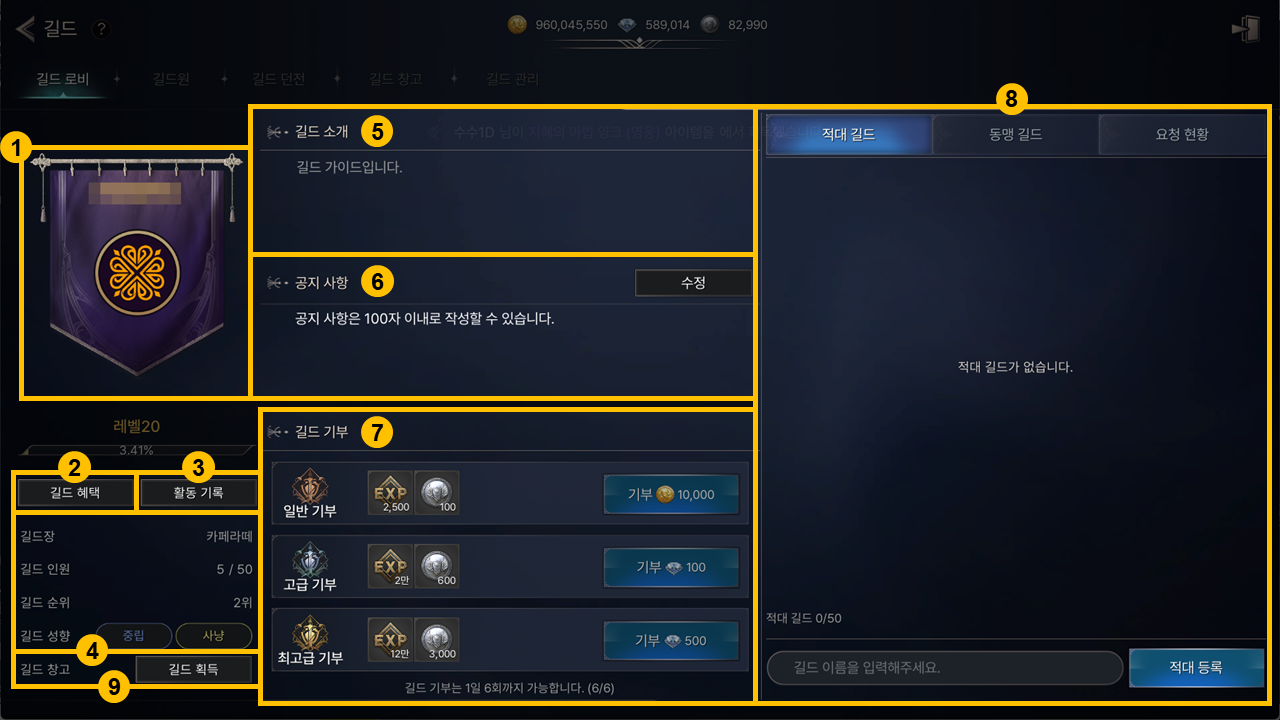 - 적대 길드, 동맹 길드를 지정 및 해제할 수 있으며 길드 동맹 요청 목록을 확인할 수 있습니다.