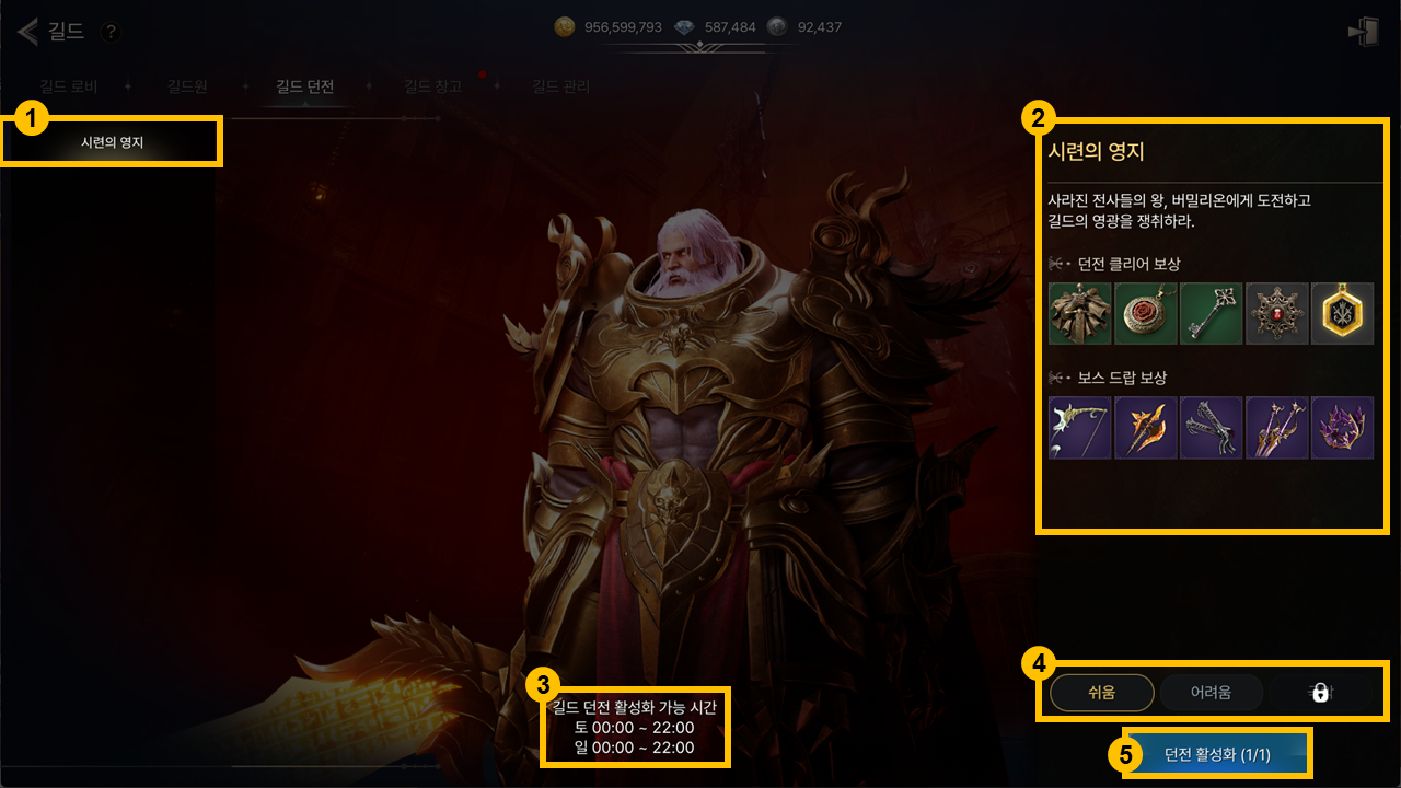 - 길드 레벨8부터 쉬움 난이도에 도전할 수 있으며, 이전 단계 클리어 시 더 높은 난이도에 도전할 수 있습니다.