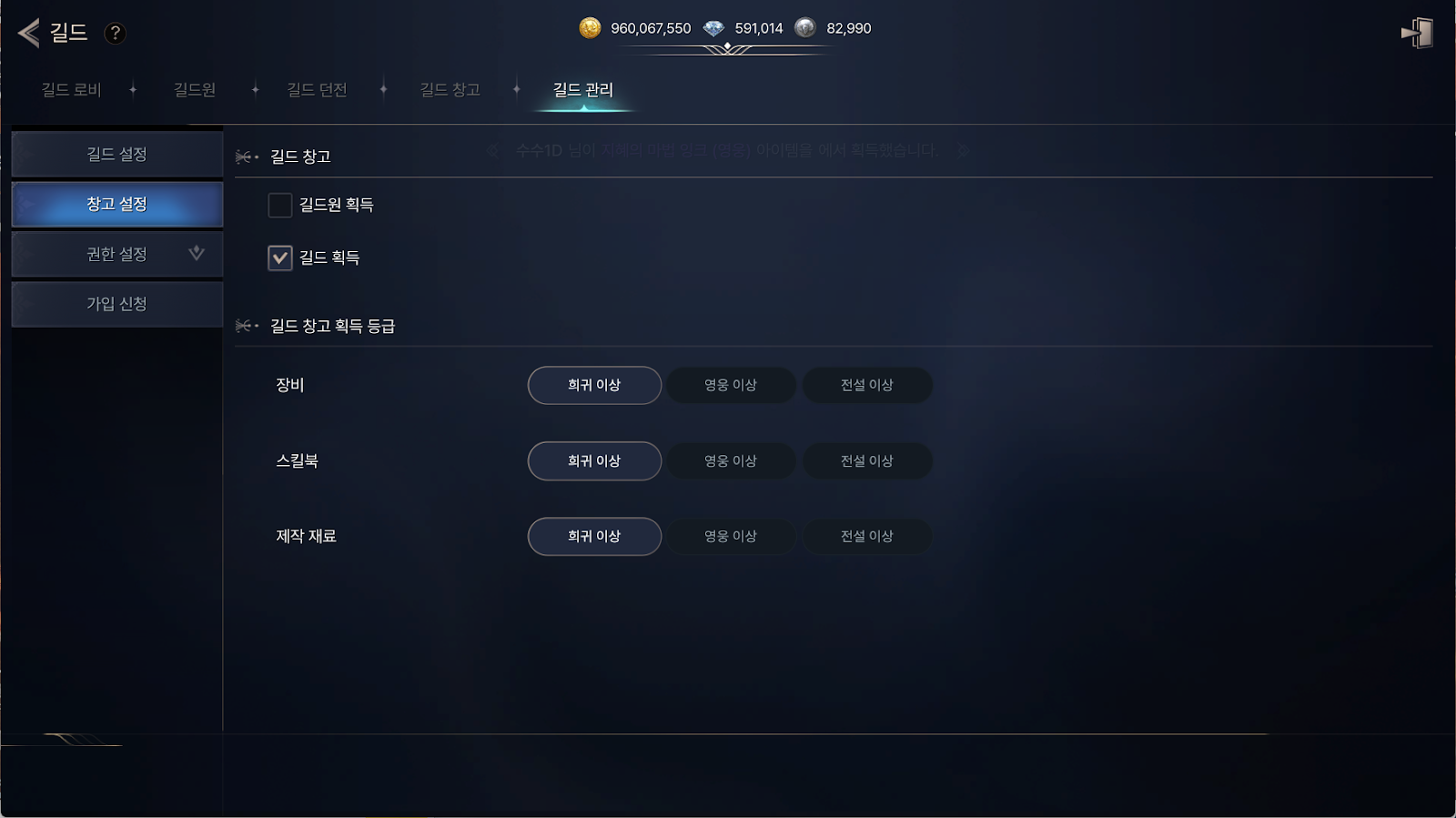 - 길드 창고 획득 설정과 길드 창고 획득 등급 설정을 할 수 있습니다.