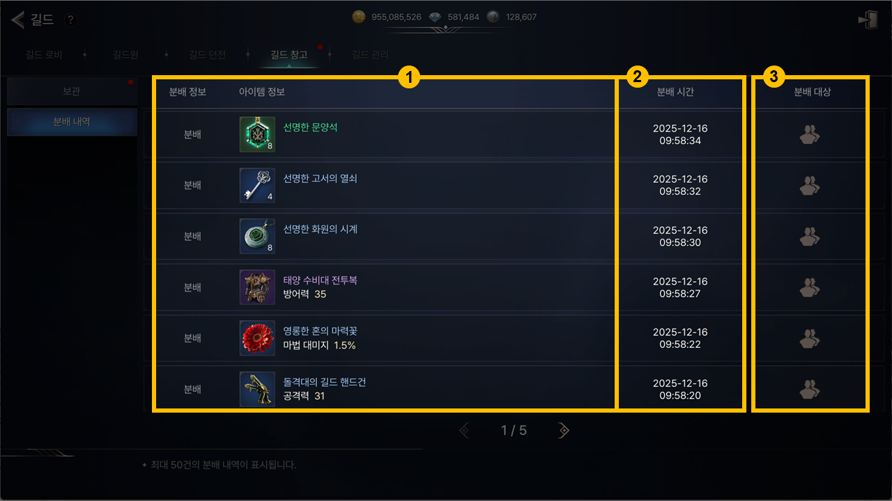 ※ 길드장만 길드 창고 아이템 및 재화를 분배할 수 있습니다.