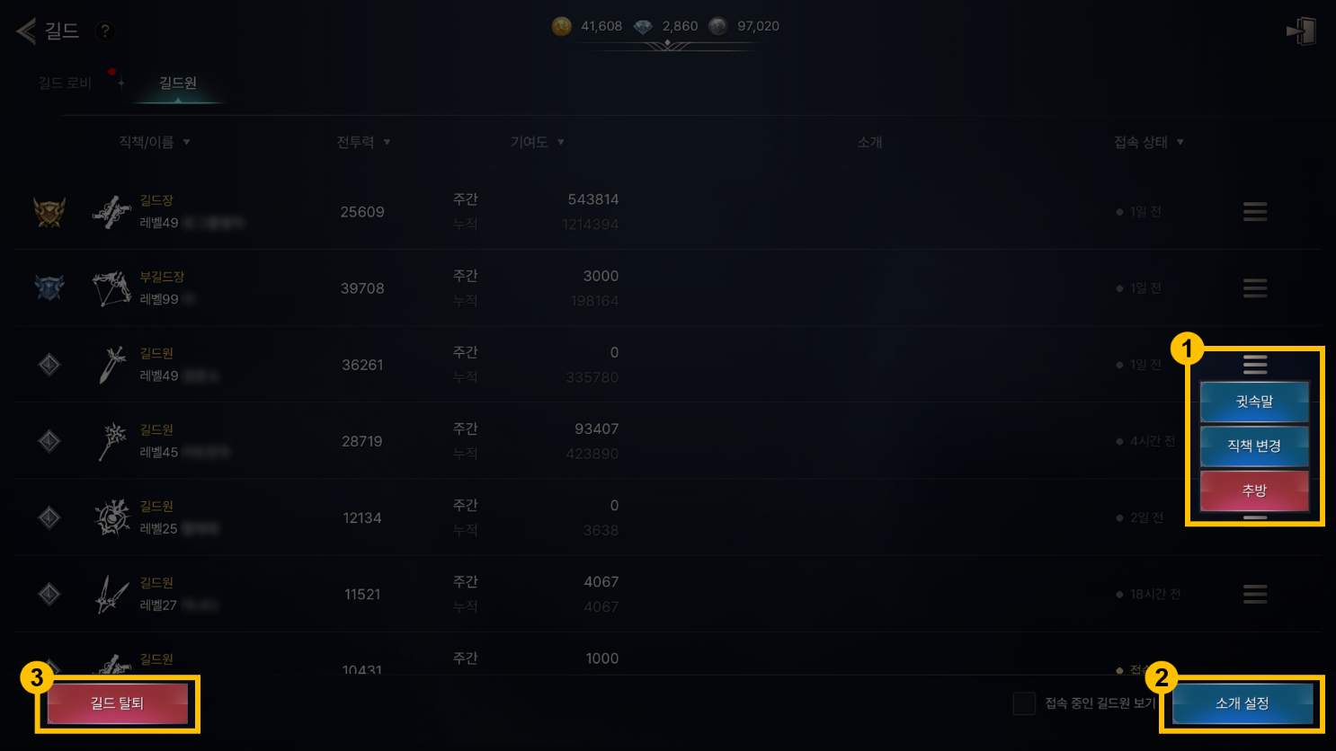 - 길드원 목록 및 정보를 확인할 수 있습니다.
