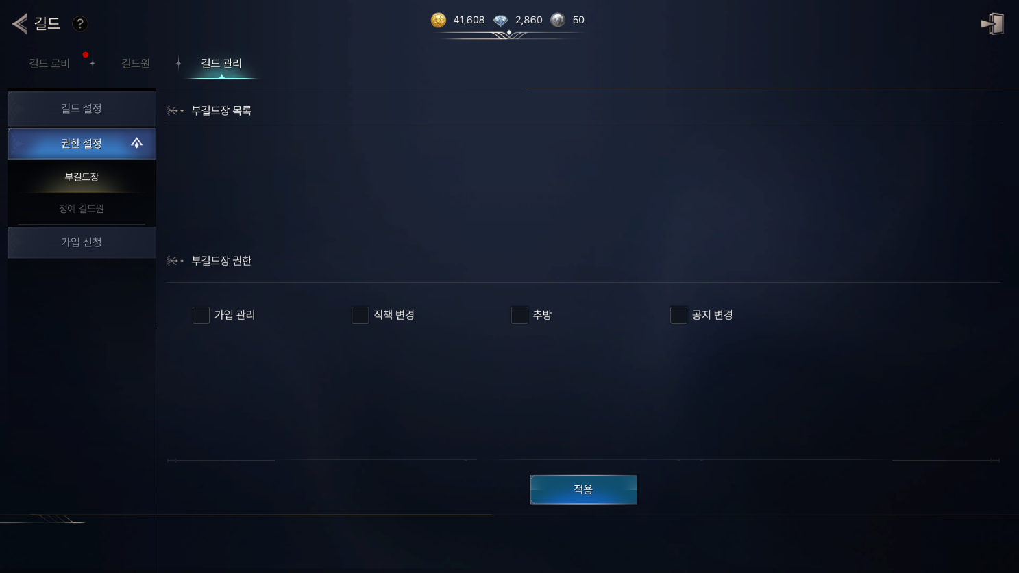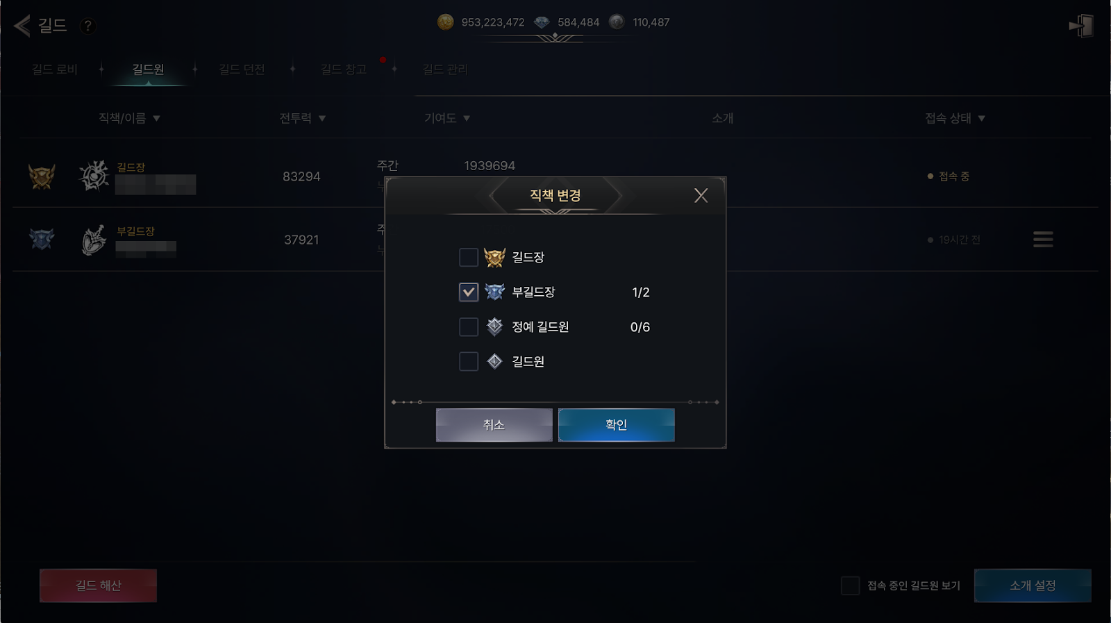 - 직책에 따라 부길드장, 정예 길드원으로 분류되며 직책에 따라 권한 설정을 할 수 있습니다.