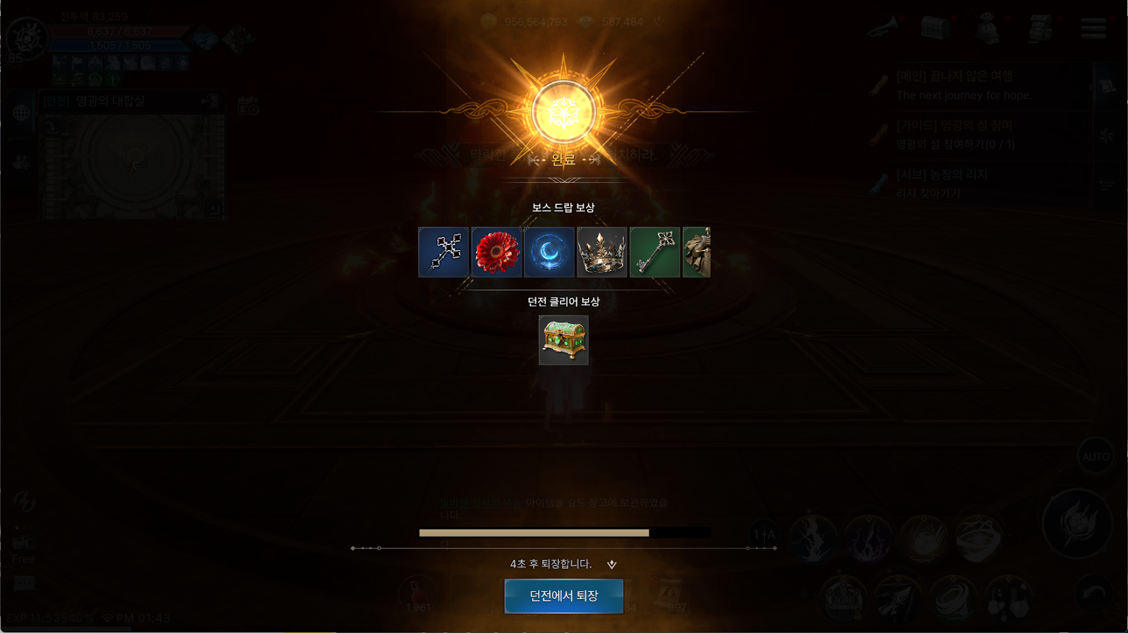 - 제한 시간 내 길드 던전 목표 완료 시 길드 던전 보상을 획득하고 자동으로 퇴장합니다.