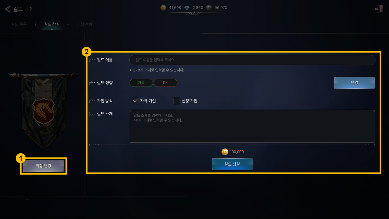 - 길드 이름, 길드 성향, 가입 방식, 길드 소개를 설정하고 창설할 수 있습니다.