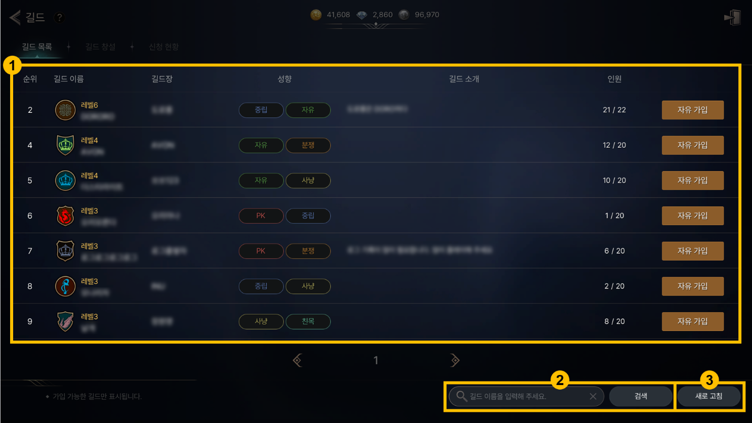 - 새로 고침 버튼을 눌러 길드 목록을 갱신할 수 있습니다.